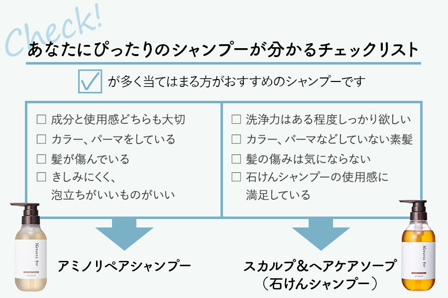 Q.アミノリペアシャンプー|私の髪にはアミノリペアシャンプーと石けんシャンプーとどちらが合うでしょうか? 2週間 ago 以下のチェックリストを参考にお選びください。 検索ワード|Natures for ヘアケア アミノ酸シャンプー 頭皮 地肌 オーガニック #Natures for #アミノリペアシャンプー #シャンプー #ヘアケア