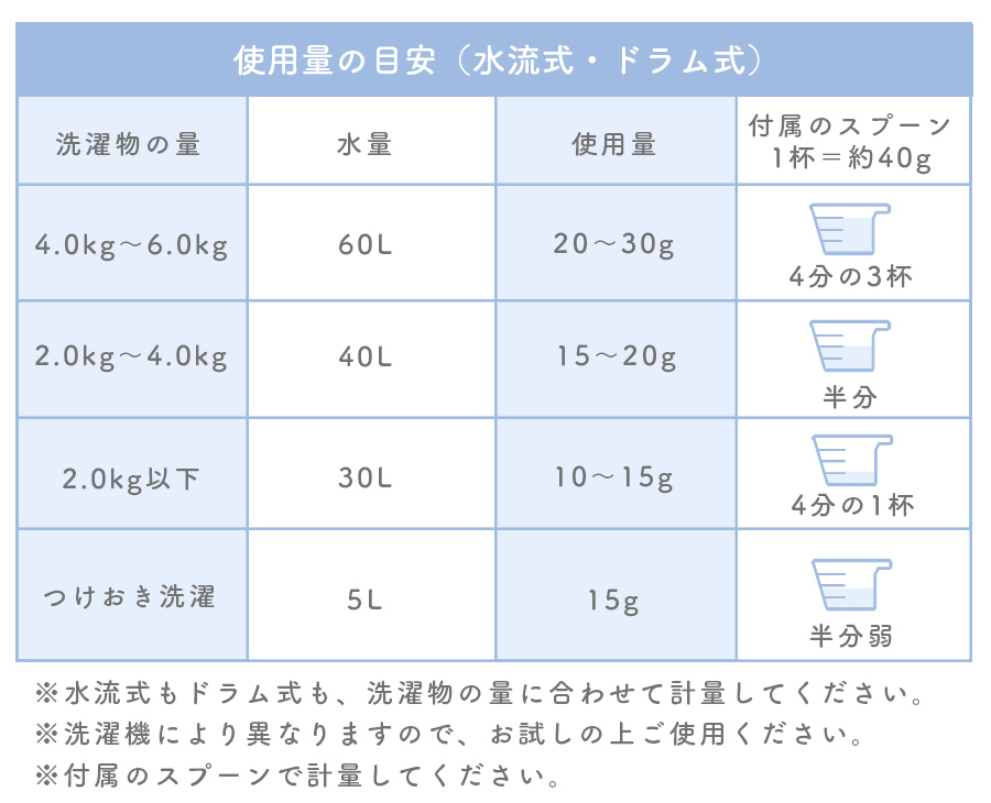 詰め込みすぎると水と洗剤が溶け合うスペースがなくなるため、溶け残りの原因になることがあります。特に厚手の洗濯物(パーカーなど)が複数枚入っている場合、溶け残りがあるとのお声をいただくことがございます。