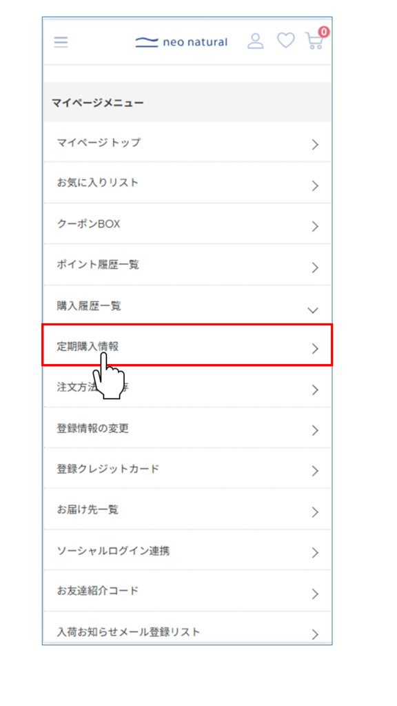 マイページにログインし「マイページメニュー/定期購入情報」ページに移動します。