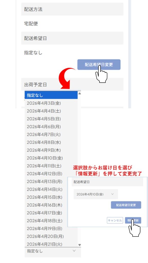 続いて最初に押した「今すぐ注文」ボタンで最短お届けに変更されているお届け日をご希望の日時に変更します。