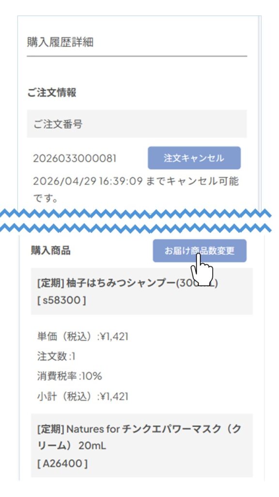 「マイページメニュー/定期購入情報」よりお手続きいただけます。