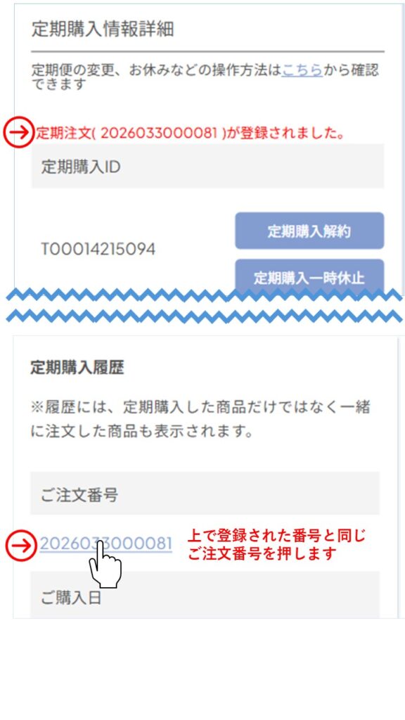 定期注文(0000000000000)が登録されました。のカッコ内と同じ番号のご注文番号を画面下から選びタップします。