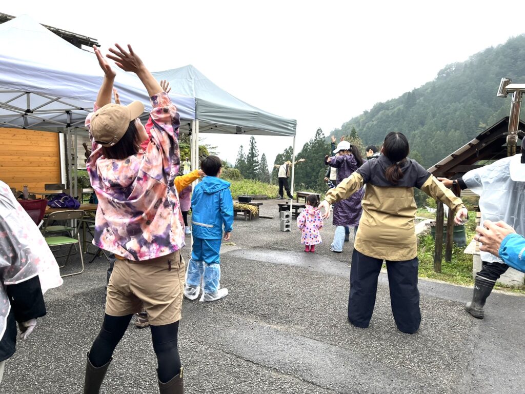 ご参加者の皆様と、まずは準備体操の里山ヨガから。
