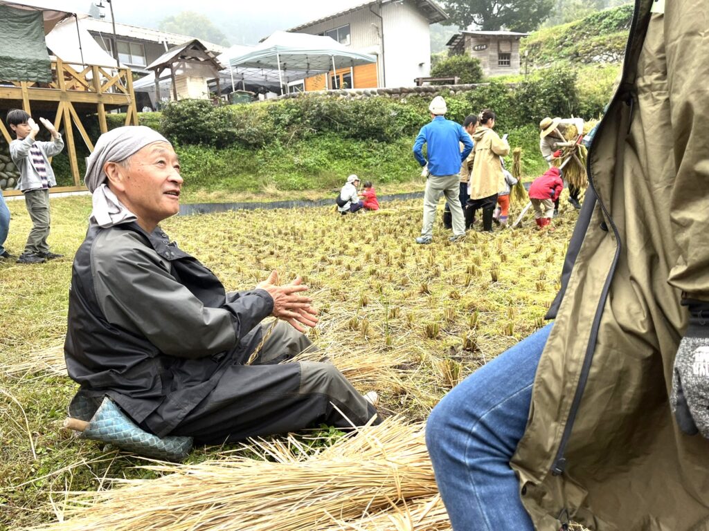 昔ながらの「はさ干し」をしたときに、稲穂がバラバラにならないように、しっかりと縛ります。単純な縛る作業ですが、稲穂が滑って難しい。