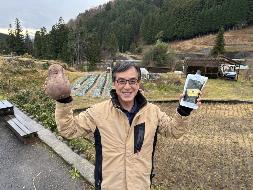 『はだ恵り』の開発者・代表の高柳が手にしているサツマイモは、背景に写っているキッチンガーデンで自然栽培しました。