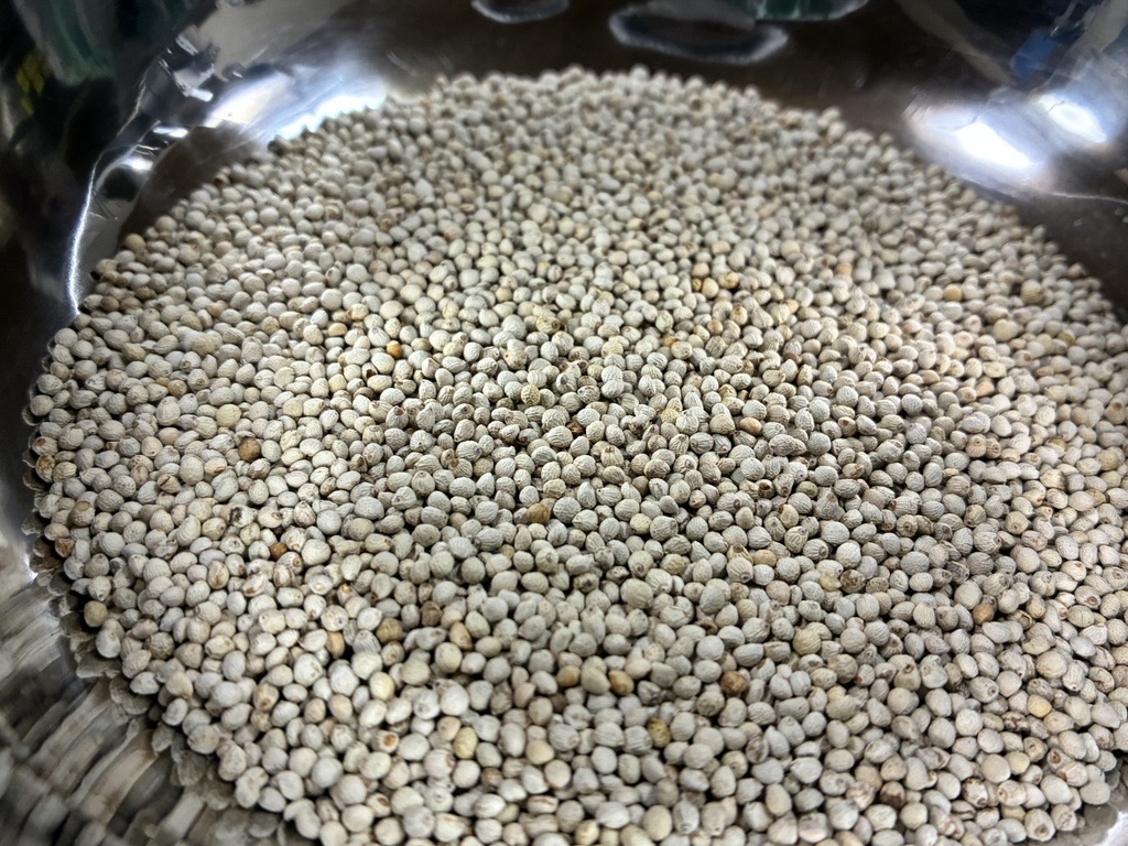 工房のテーブルに並べられた、ポリフェノールやビタミンなど栄養豊富なエゴマ。