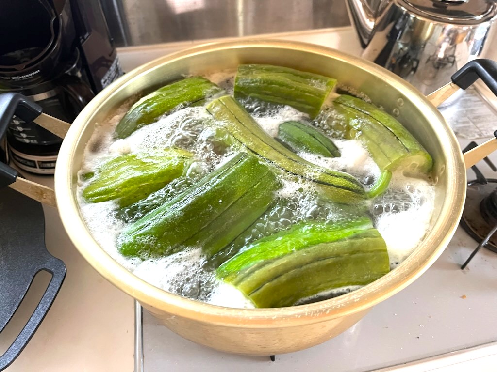 夏場に色の良い状態でたわしを作るときは、鍋でぐつぐつ煮て、