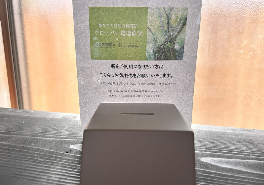 「お気持ち(500円ほど)」を募金箱に入れていただけると、この豊かな森を守る活動や、次の薪を準備するための大きな助けになります。