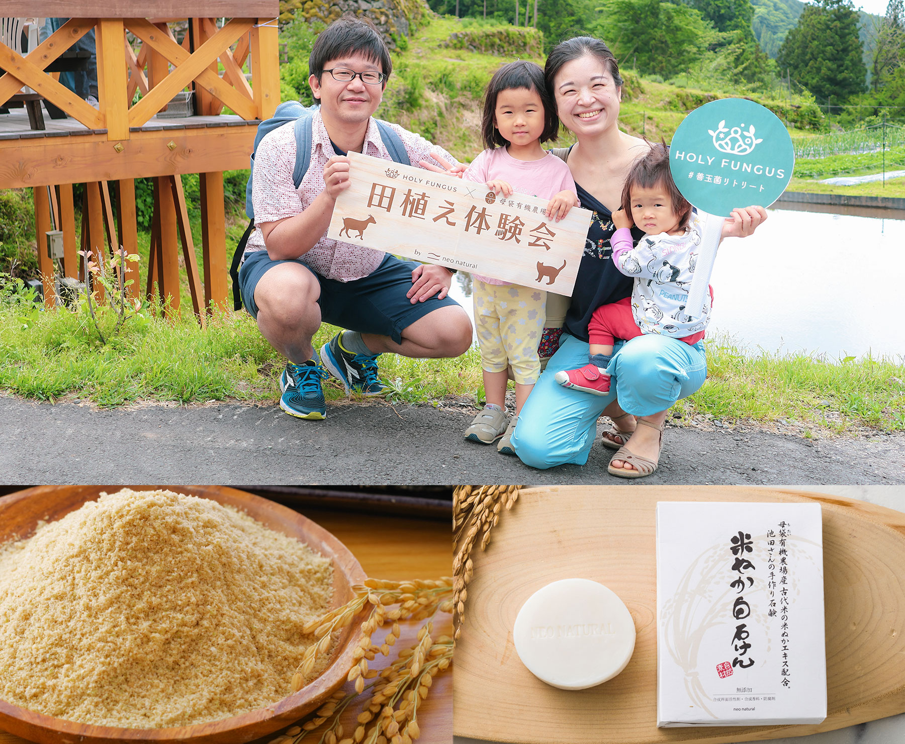 お米は秋に収穫後さらに美味しくなるよう天日干しをして、参加者の皆さまに後日お届けします。そして米ぬかは石けん、お米は甘酒など、ネオナチュラルの製品へと生まれ変わります。