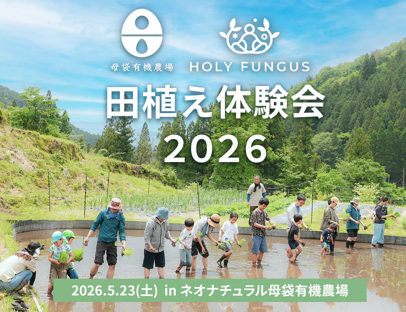 そこで・・・日帰りでのイベント体験プランだけでなく、5月22日(金) or 5月23日(土)にHOLY FUNGUSに宿泊いただき、田植え体験にご参加いただける宿泊セットプランもご用意!心地よい空気あふれる農場で、善玉菌リトリートを思いっきり体感してください♪